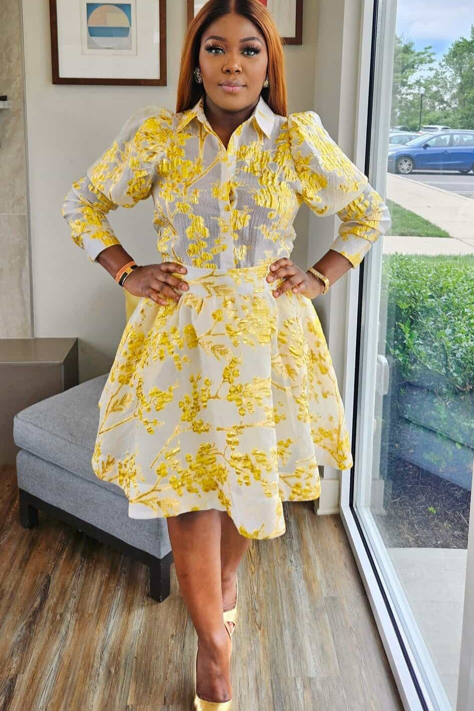 A vision of modern grandeur, this imported set elevates brocade organza into wearable art. The shirt’s voluminous exaggerated sleeves exude couture-level drama, while the short skater skirt, accented with discreet pockets, brings youthful energy to the look. Rich in texture yet effortless in movement, this pairing strikes a daring harmony between opulence and sophistication — designed for those who embrace fashion as statement, not suggestion.
