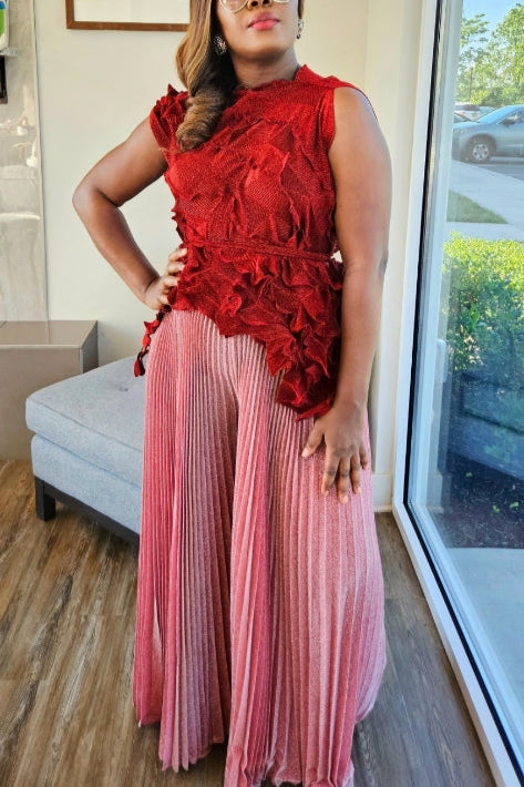 Effortlessly striking, this imported ensemble pairs a fluid, ruffle-draped belted asymmetric top with wide-leg palazzo pants that shimmer with subtle luminosity. The top’s artful silhouette offers modern elegance, while the flowing trousers create graceful movement with every step. Designed for statement-making occasions, this pairing balances refined sophistication with a touch of contemporary glamour.